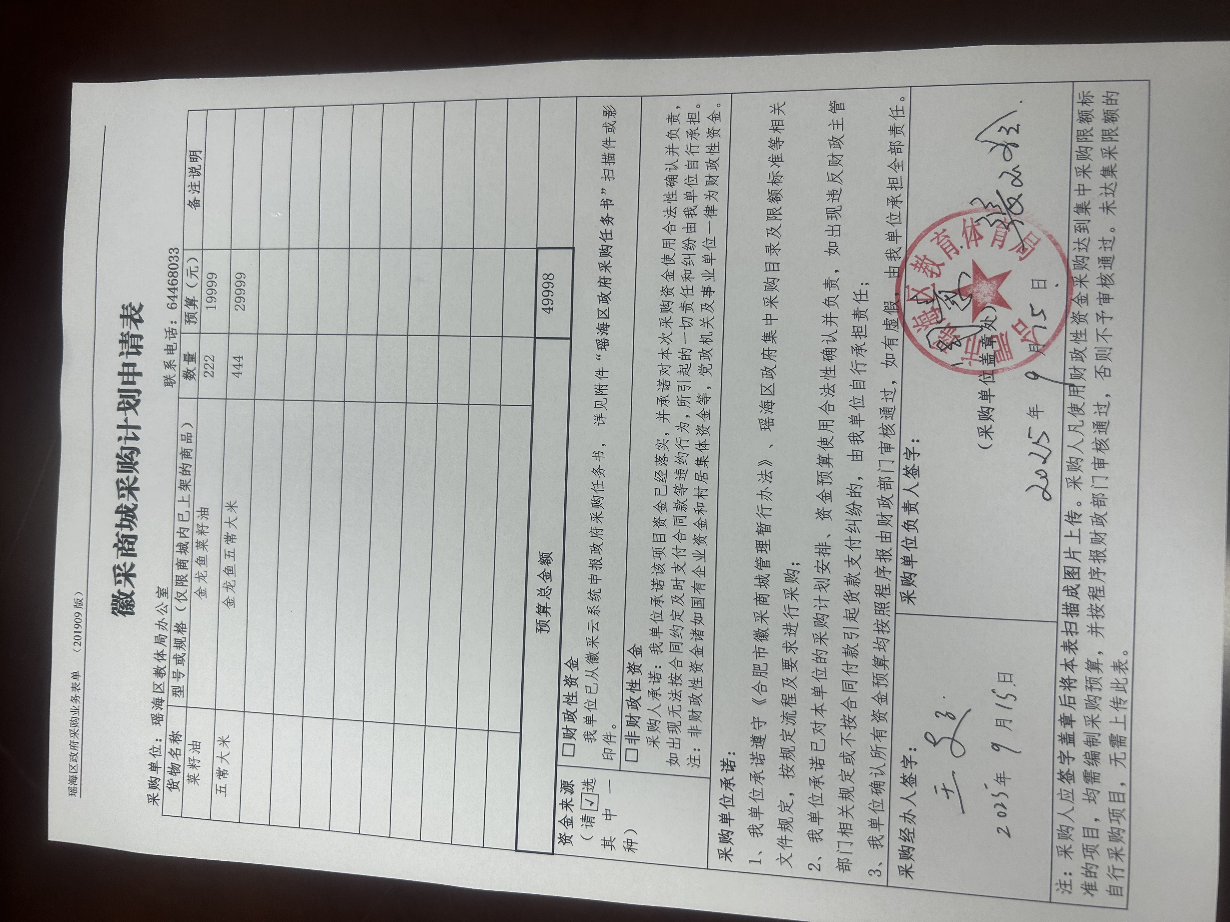 商品名称 参数要求 购买数量 控制金额(元) 建议品牌 米面机械 核心参数要求:商品类目: 米面机械; 传送带规格(mm):500;型号:五常大米5kg;次要参数要求: 444件 29999.00 金龙鱼 菜籽油 核心参数要求:商品类目: 菜籽油; 净含量:5L;包装规格:单桶;销售规格:1桶;型号:菜籽油5L;次要参数要求: 222桶 19999.00 金龙鱼 买家留言:-